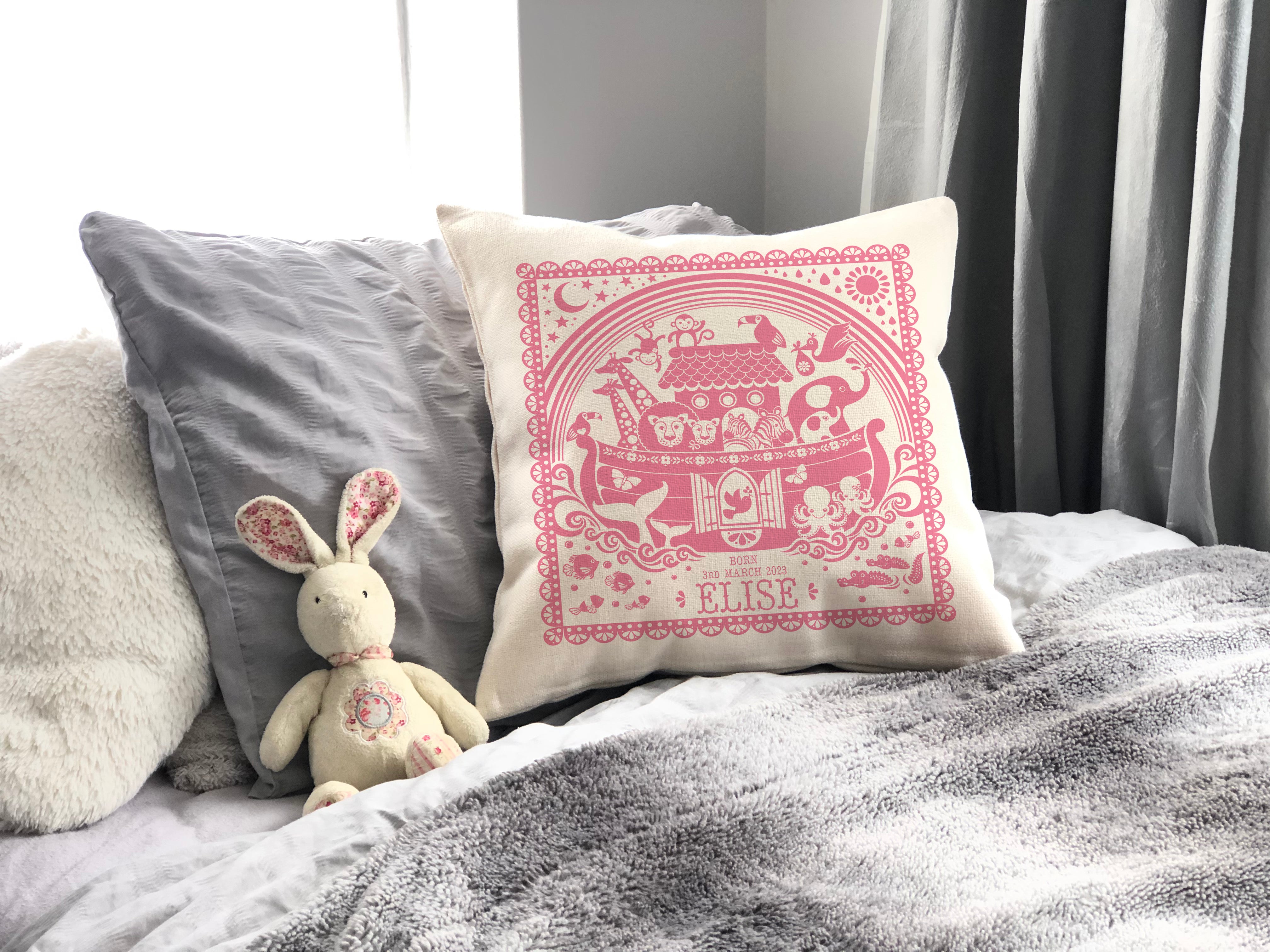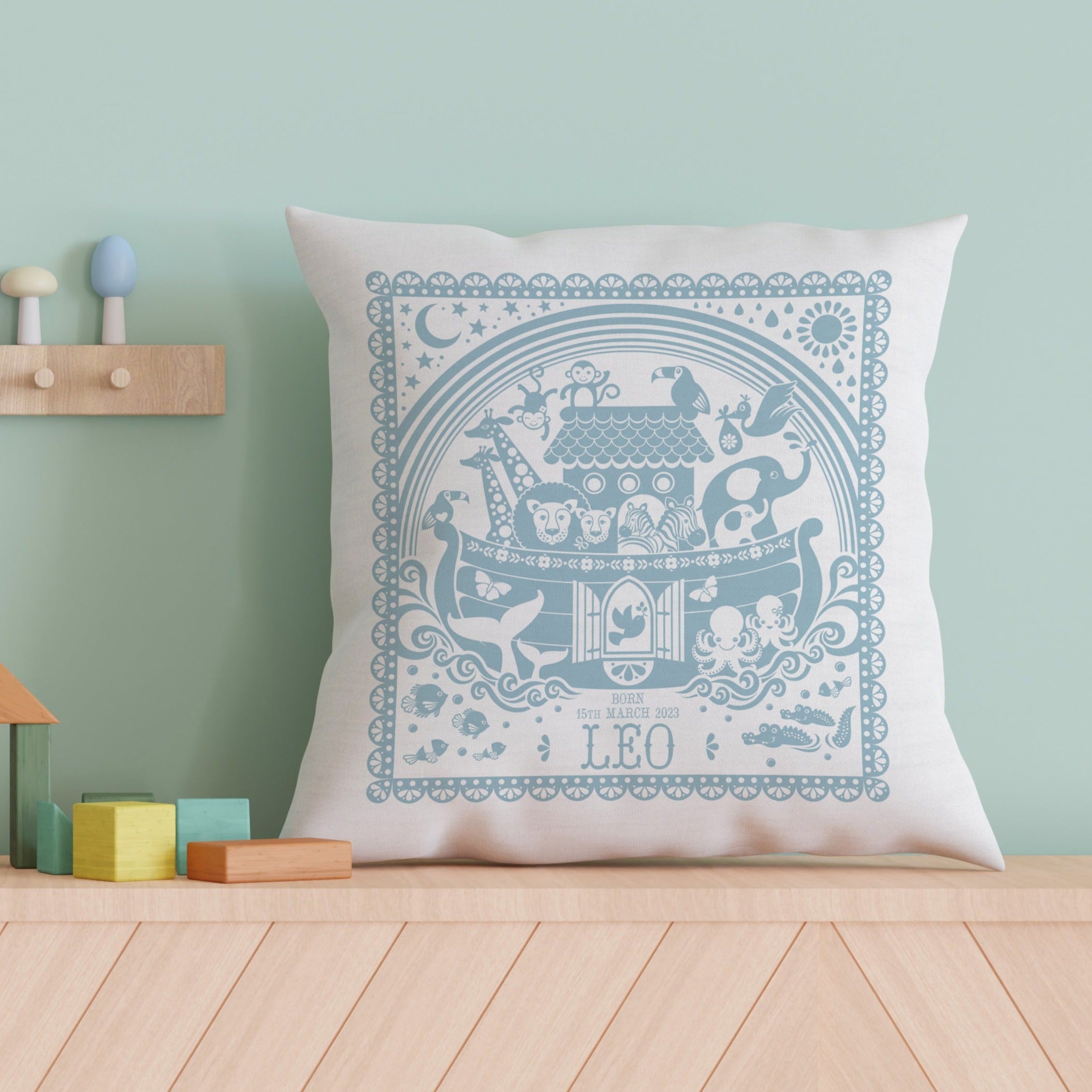A beautiful, personalised Noah's ark cushion that would make a unique gift for a Christening or Baptism.