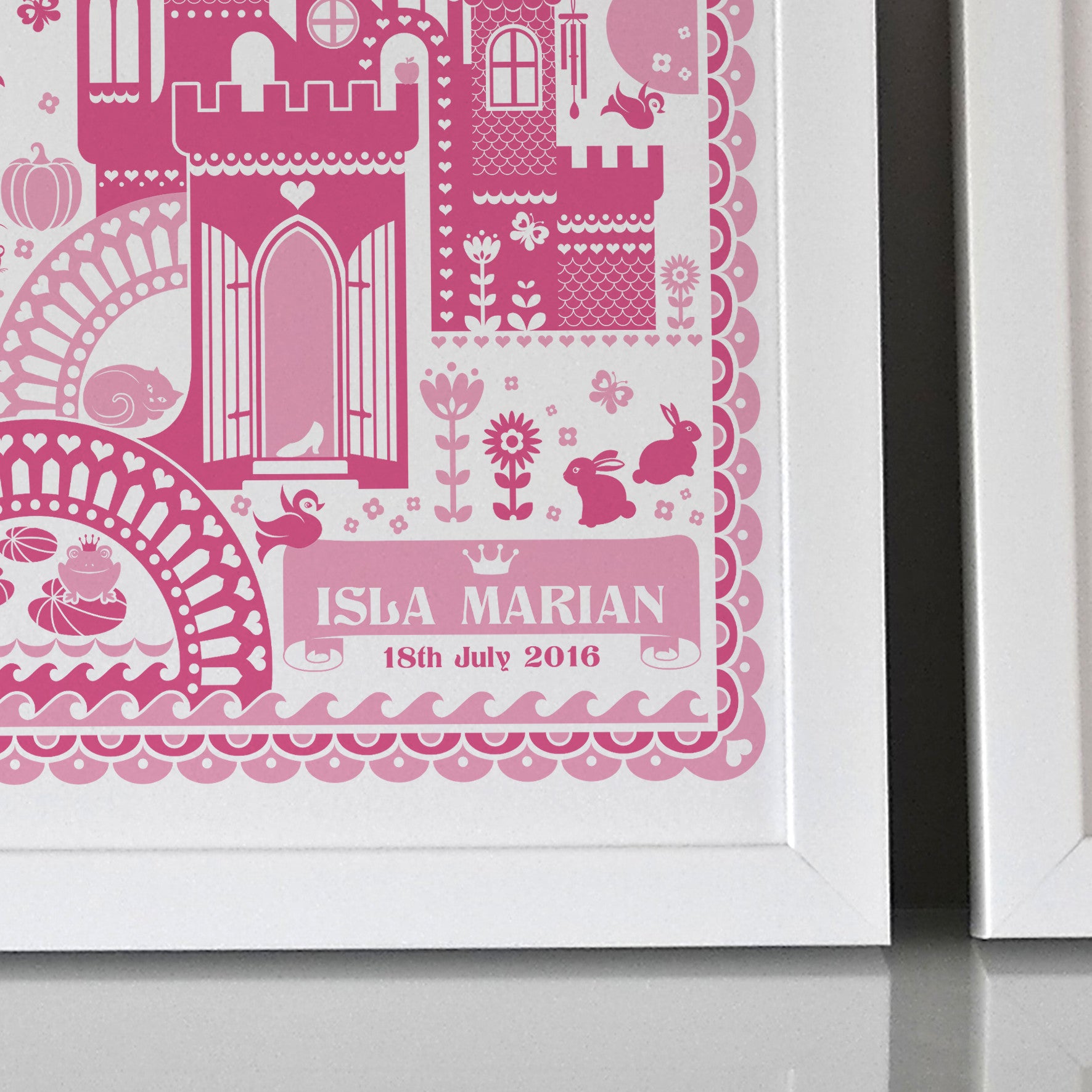 This personalised illustration will be the perfect backdrop for any little princess's bedroom or nursery wall. Ideal as a gift for a new baby, christening present or birthday, or as a special keepsake for you and your little one to treasure.