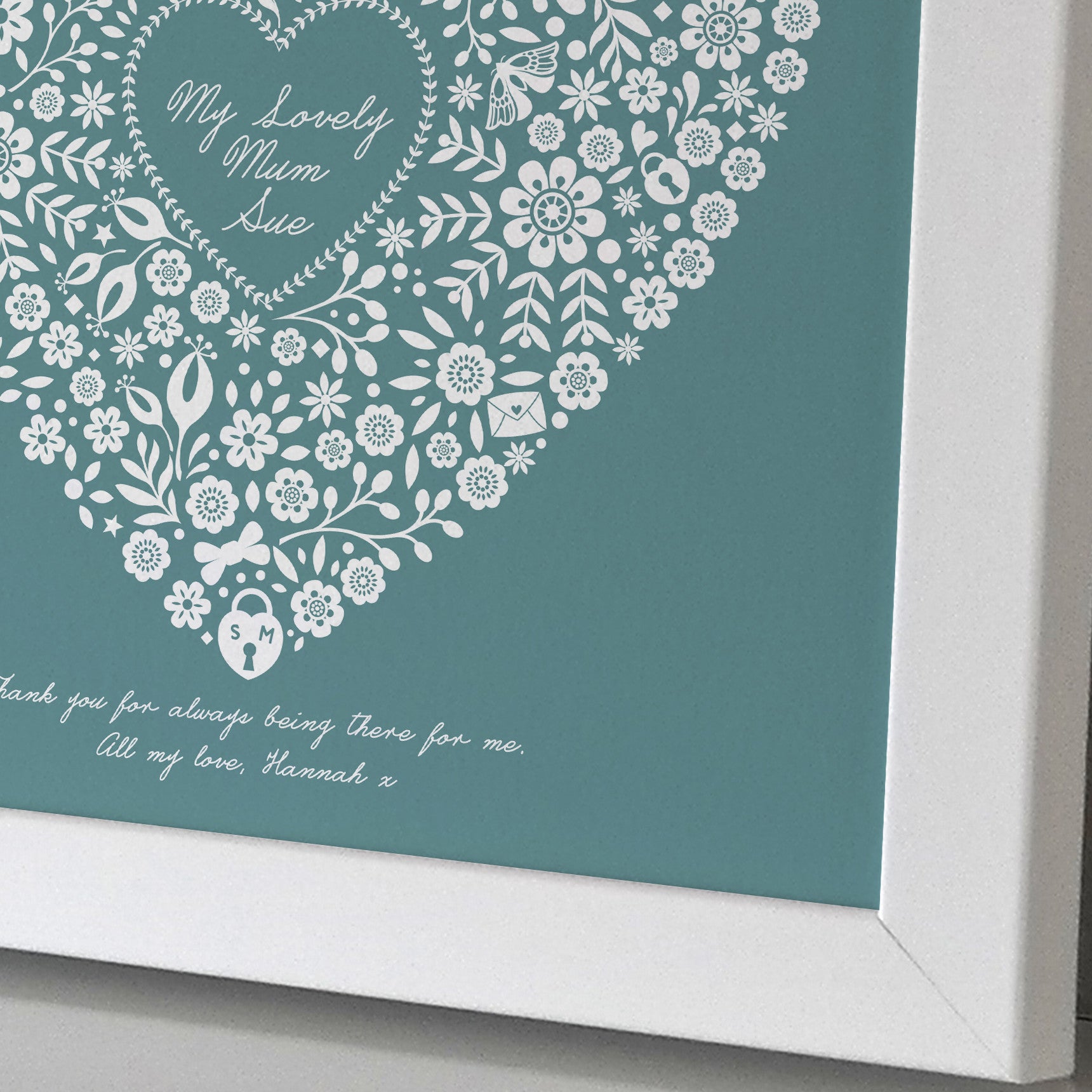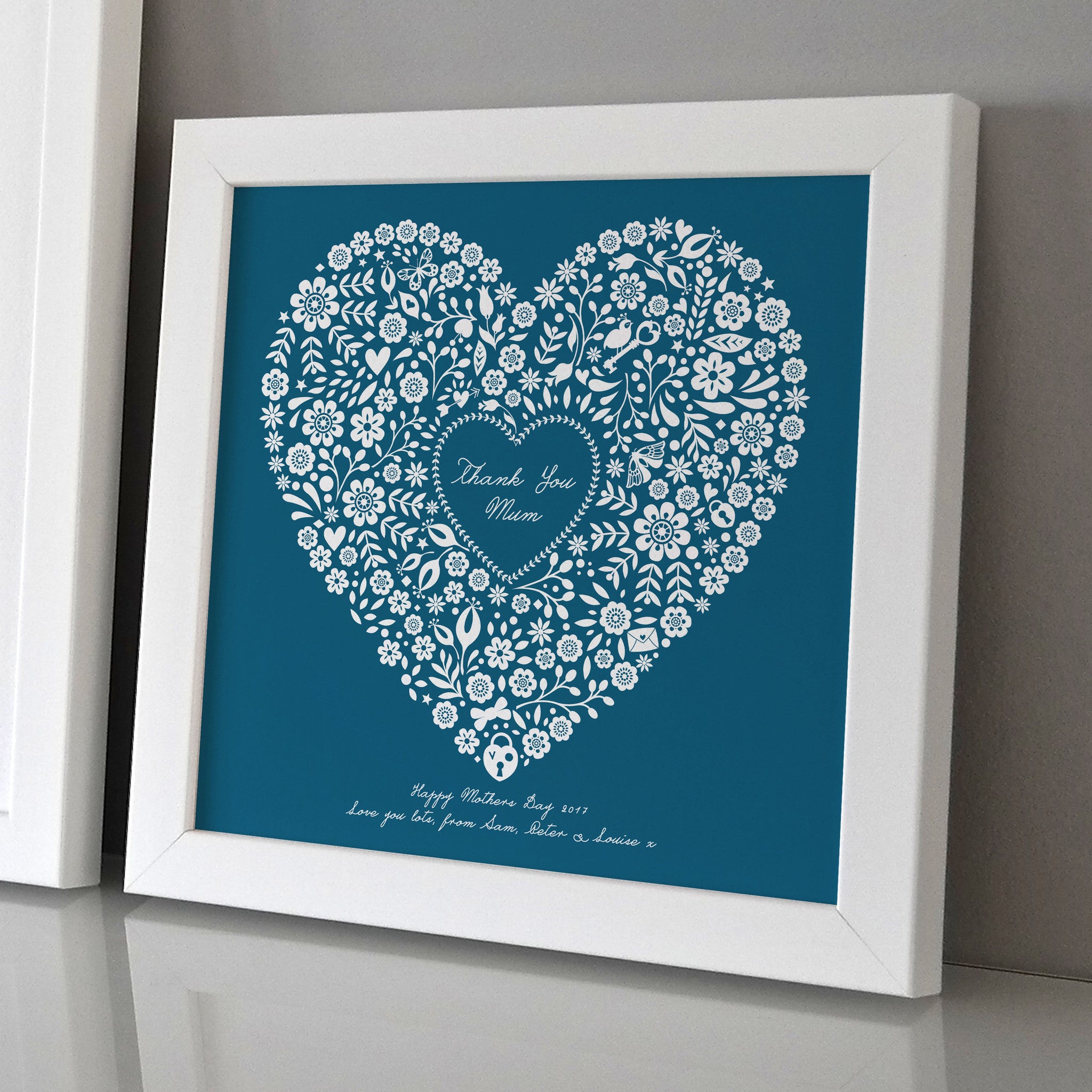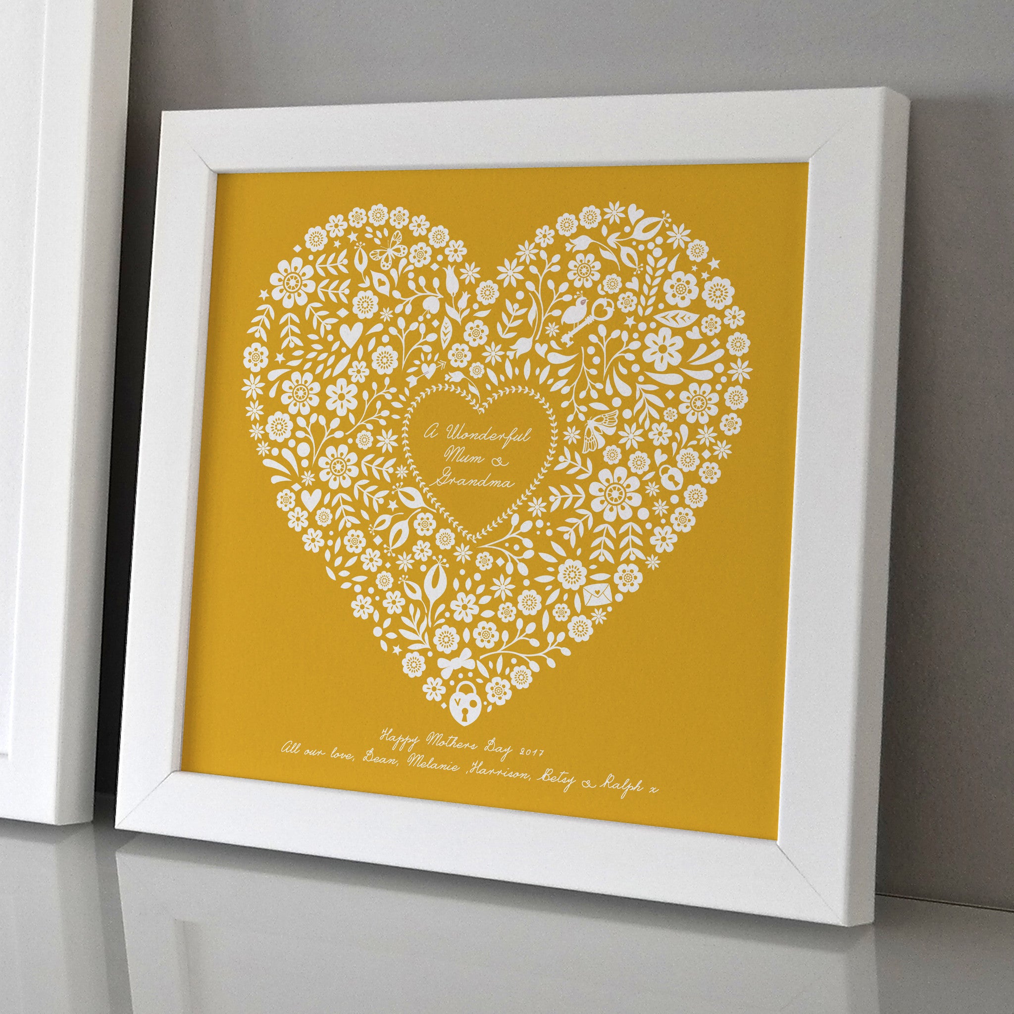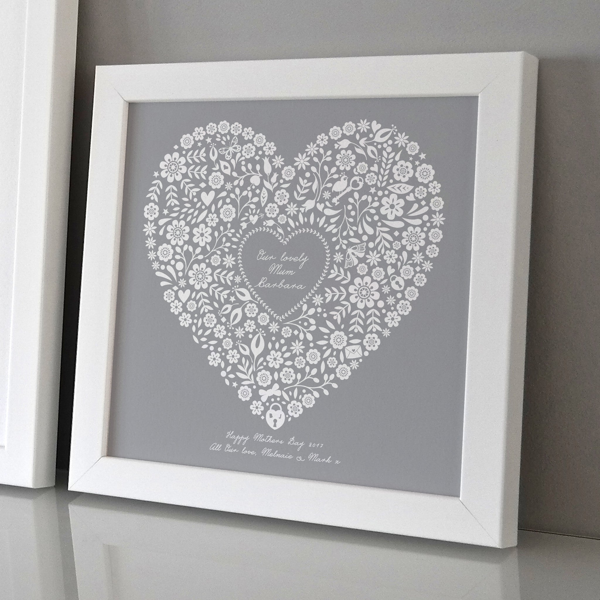 A beautiful framed personalised heart print that will make the perfect gift on Mothers day.