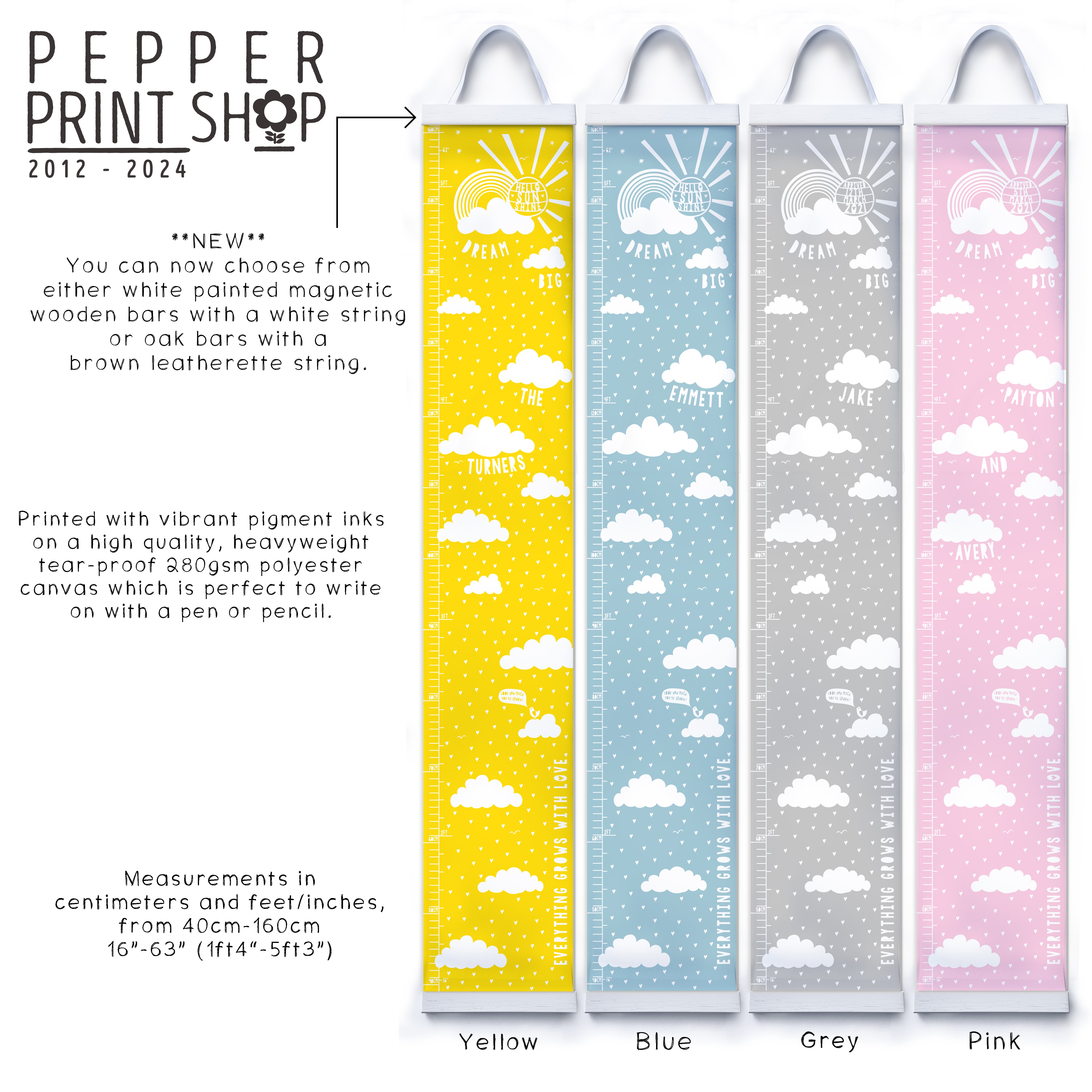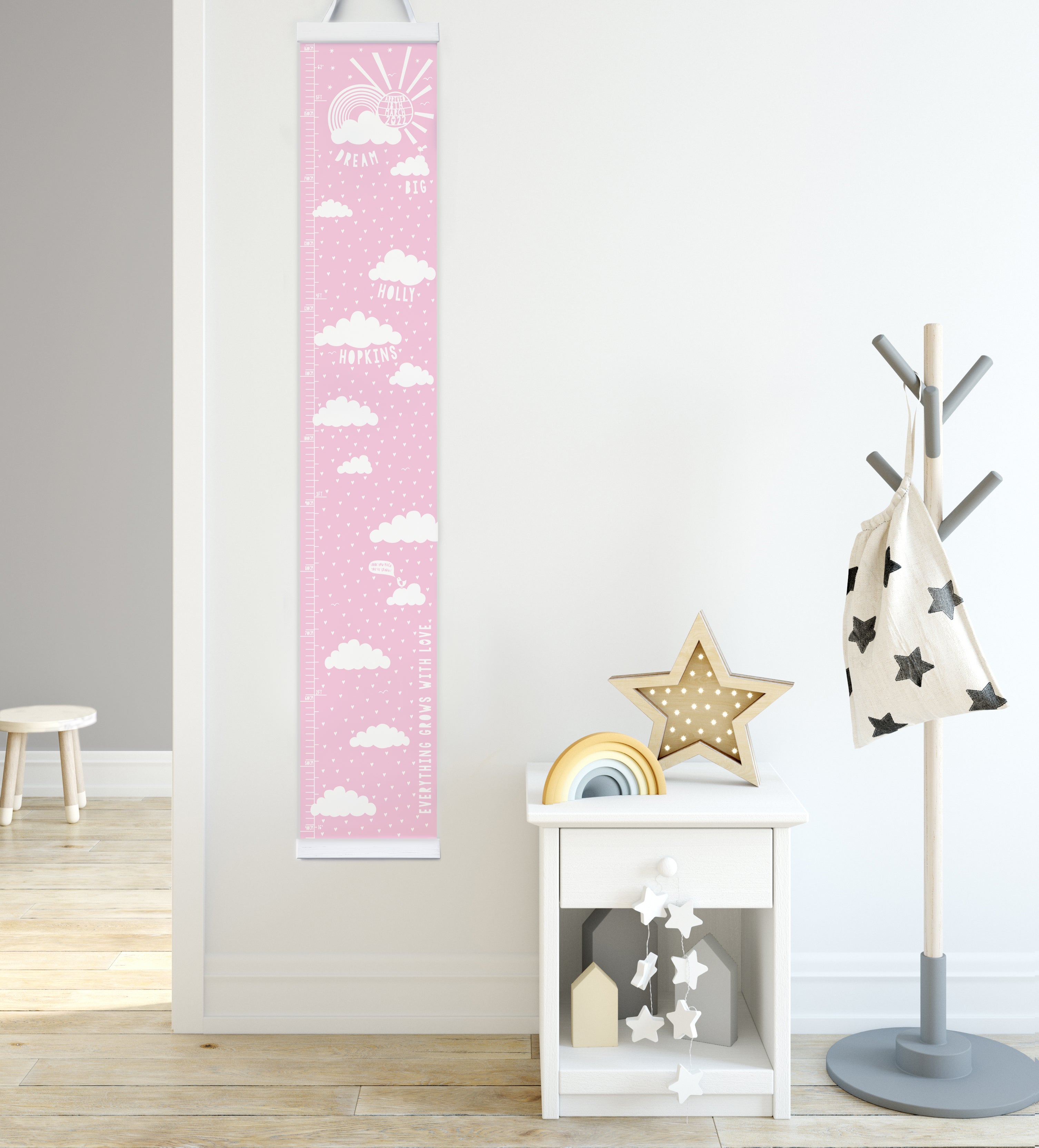 Children grow up so quickly and this is a wonderful way to keep track of every centimetre of your child's growth. The child's name is placed amongst the clouds, e.g., Dream Big Beatrice, and the sunshine above is personalised to include their date of birth. This design is also available non-personalised, with the phrase 'Dream big'.