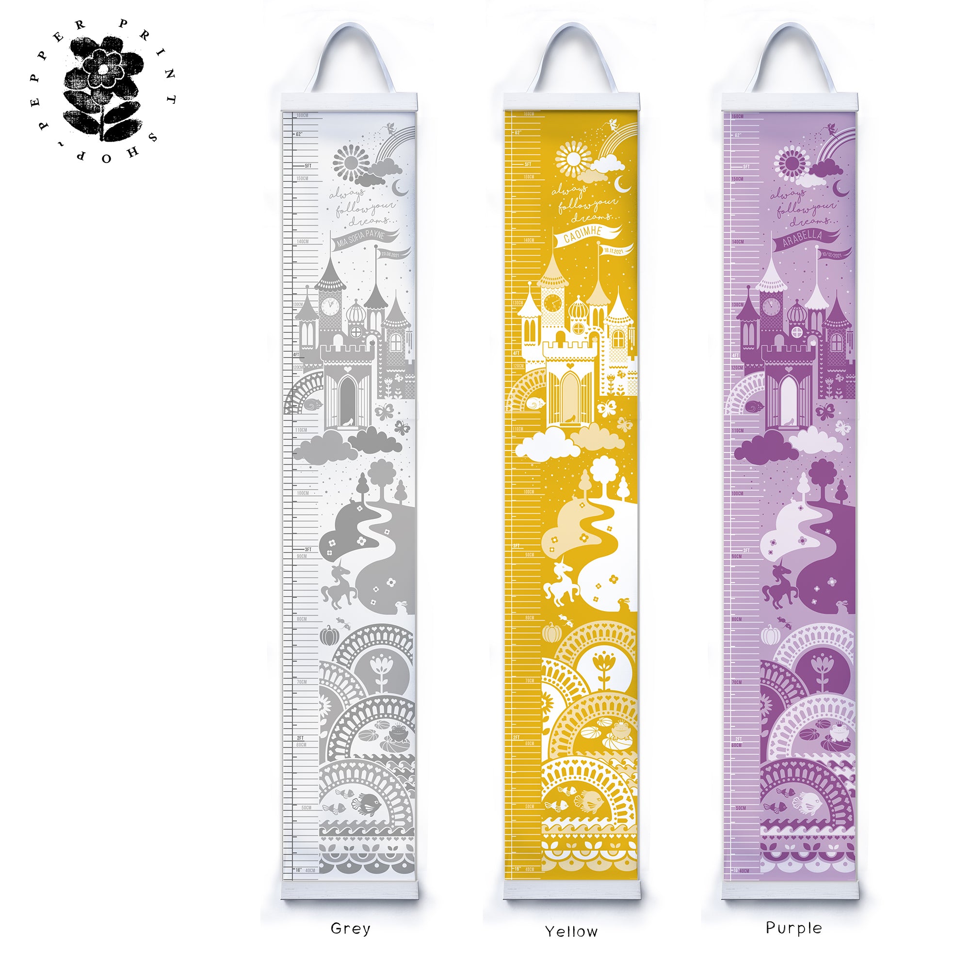 Children grow up so quickly and this is a wonderful way to keep track of every centimetre of your child's growth. Your Personalised height chart is custom made to order using your chosen name(s) and date of birth ,eg., Betsy, 21.5.2021. The name and date of birth are proudly presented in the castle flags and can be left blank if you prefer your chart to be non personalised.