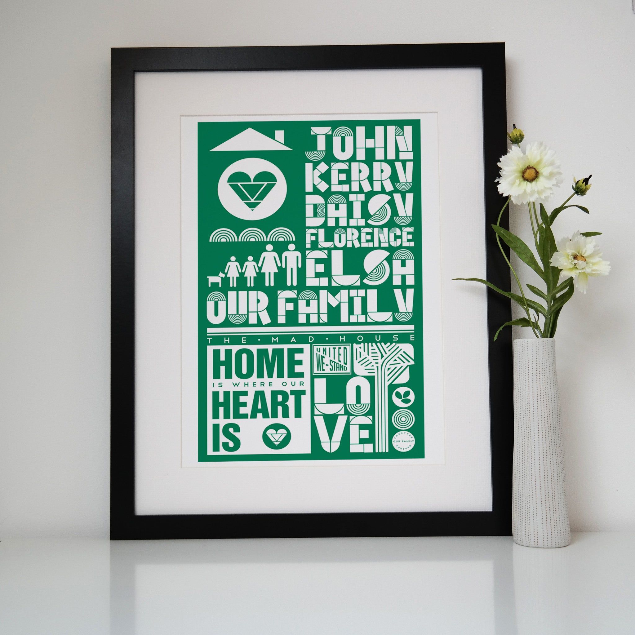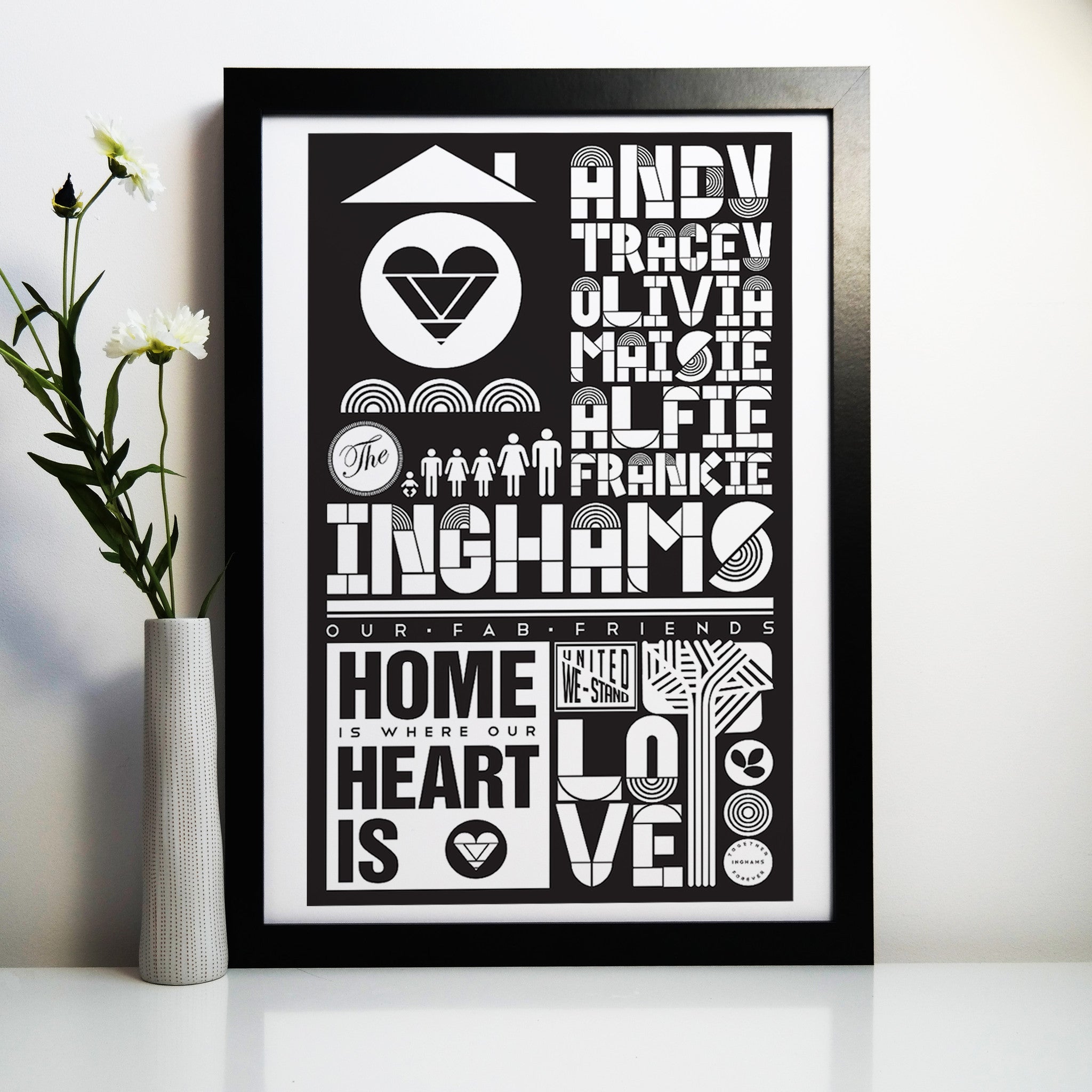 Your family names poster is custom made to order by using your chosen names, images and words to create an eyecatching and unique piece of artwork.