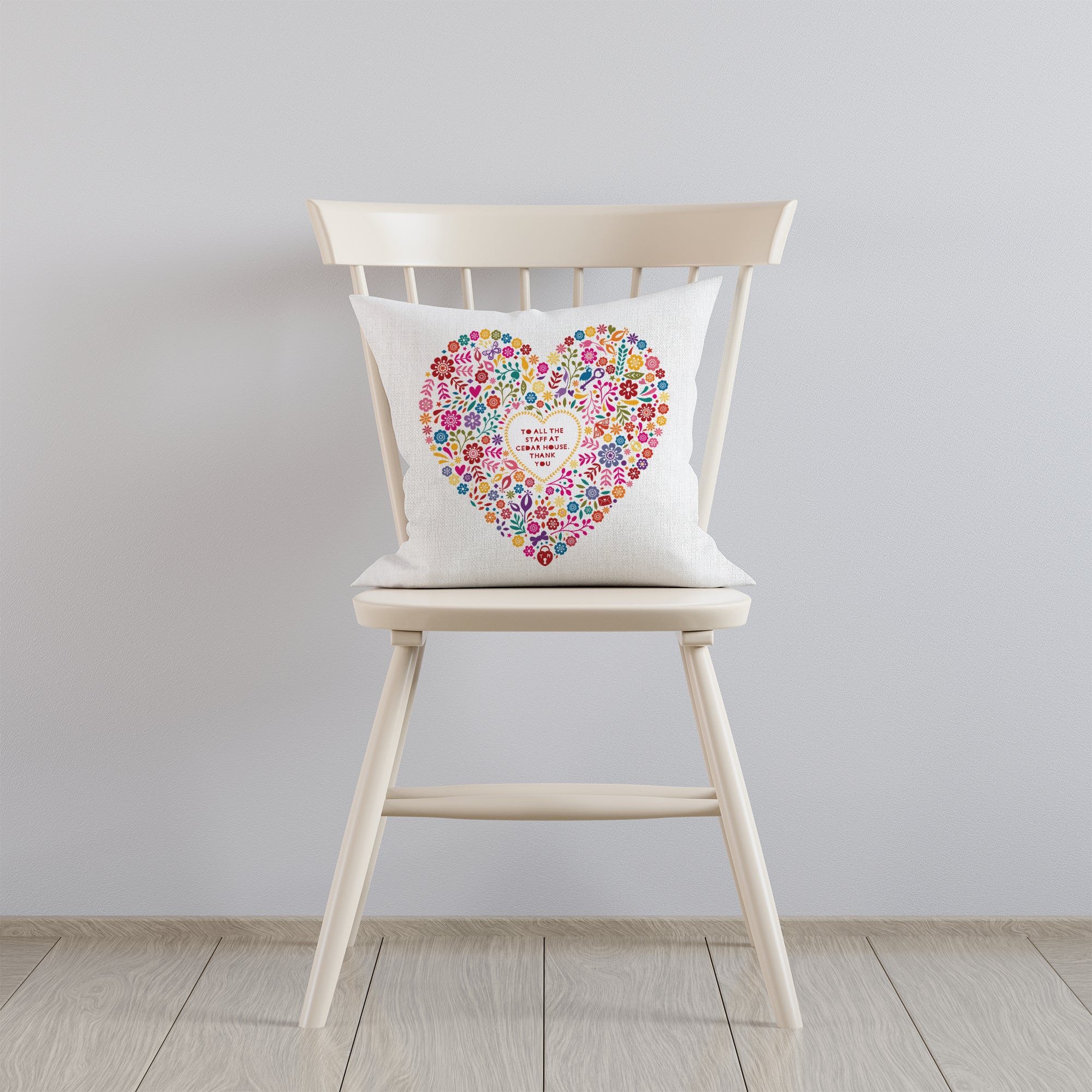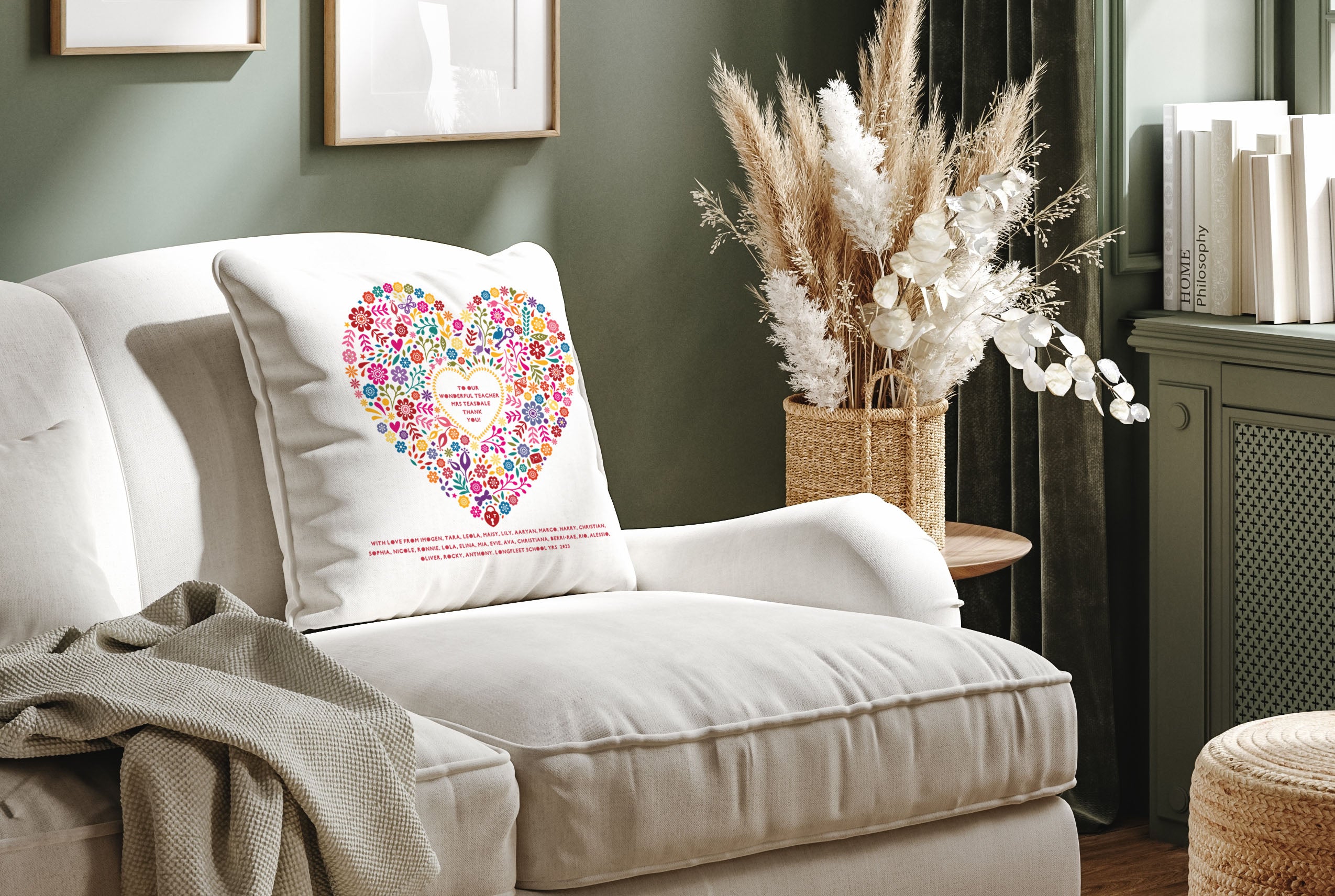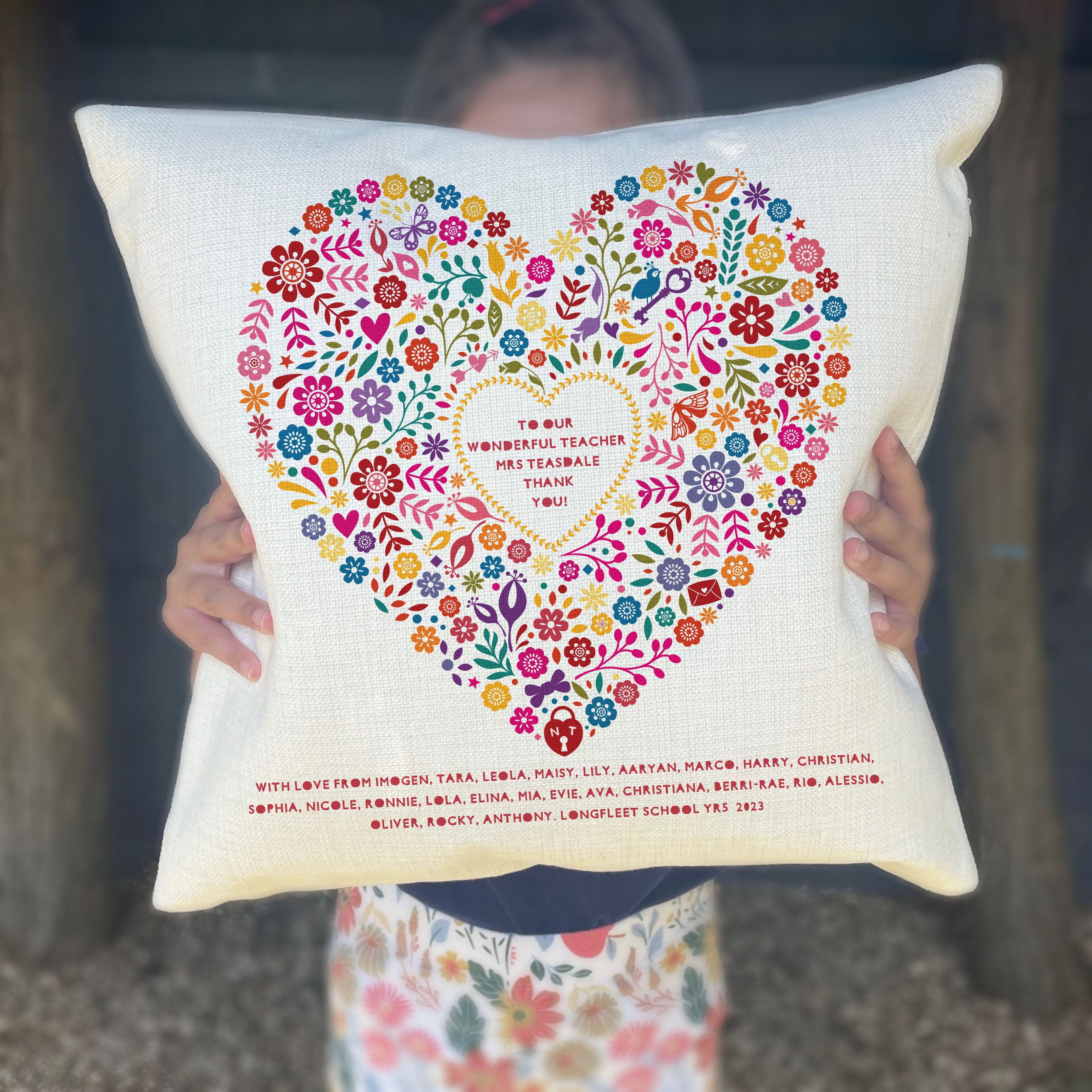 A personalised floral heart linen style cushion that will make a wonderful thank you gift for a much loved teacher!