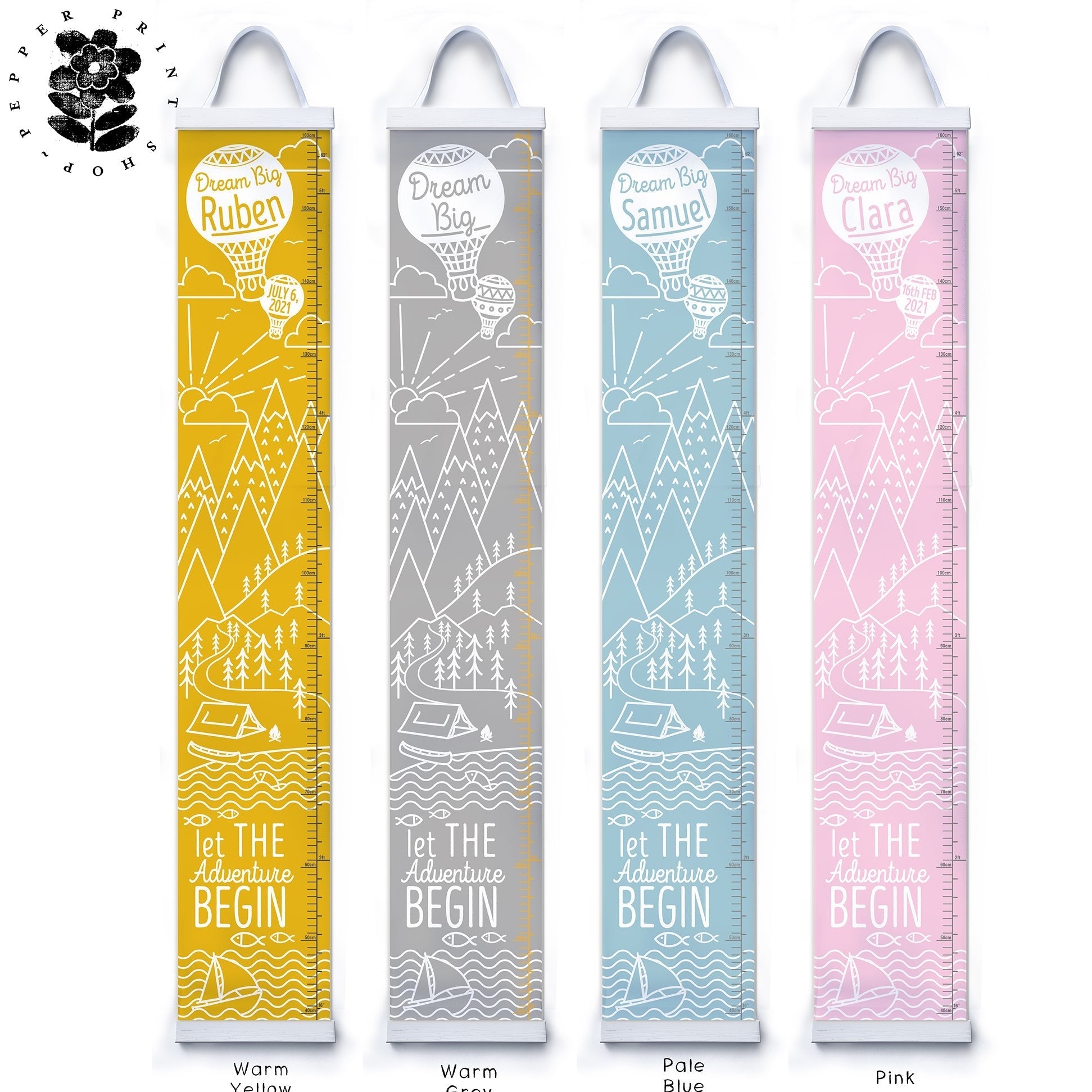 This outdoor themed height chart is the perfect accessory for a little adventurers nursery or bedroom. Let their imagination run wild with dreams of adventures to come, whether it be flying in a hot air balloon, climbing a mountain, camping in the great outdoors, or sailing across the oceans!