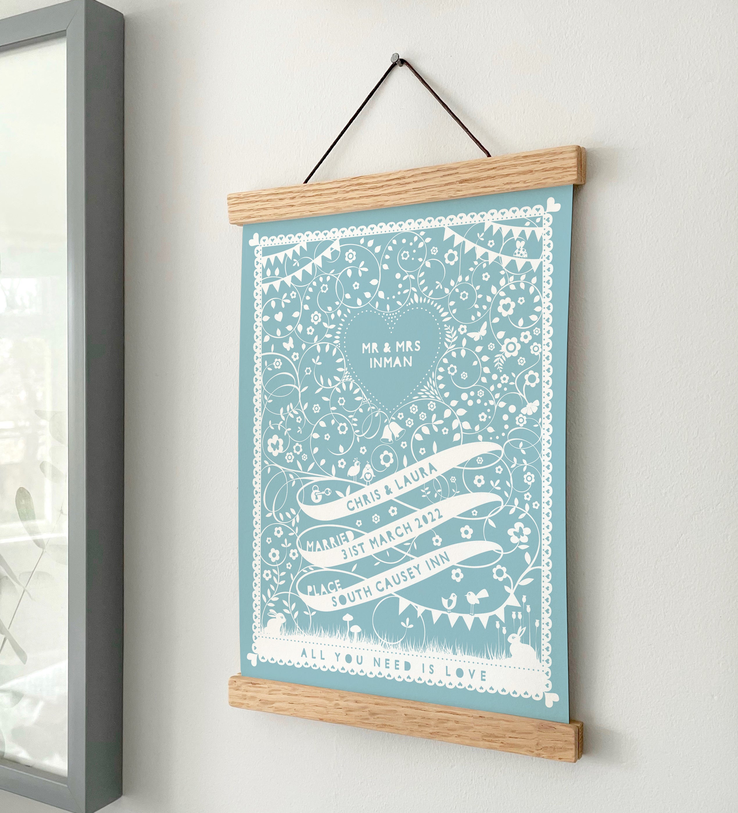You can also purchase your A4 or A3 design with a set of 4 solid oak hangers which can be hung with a brown leatherette string.
