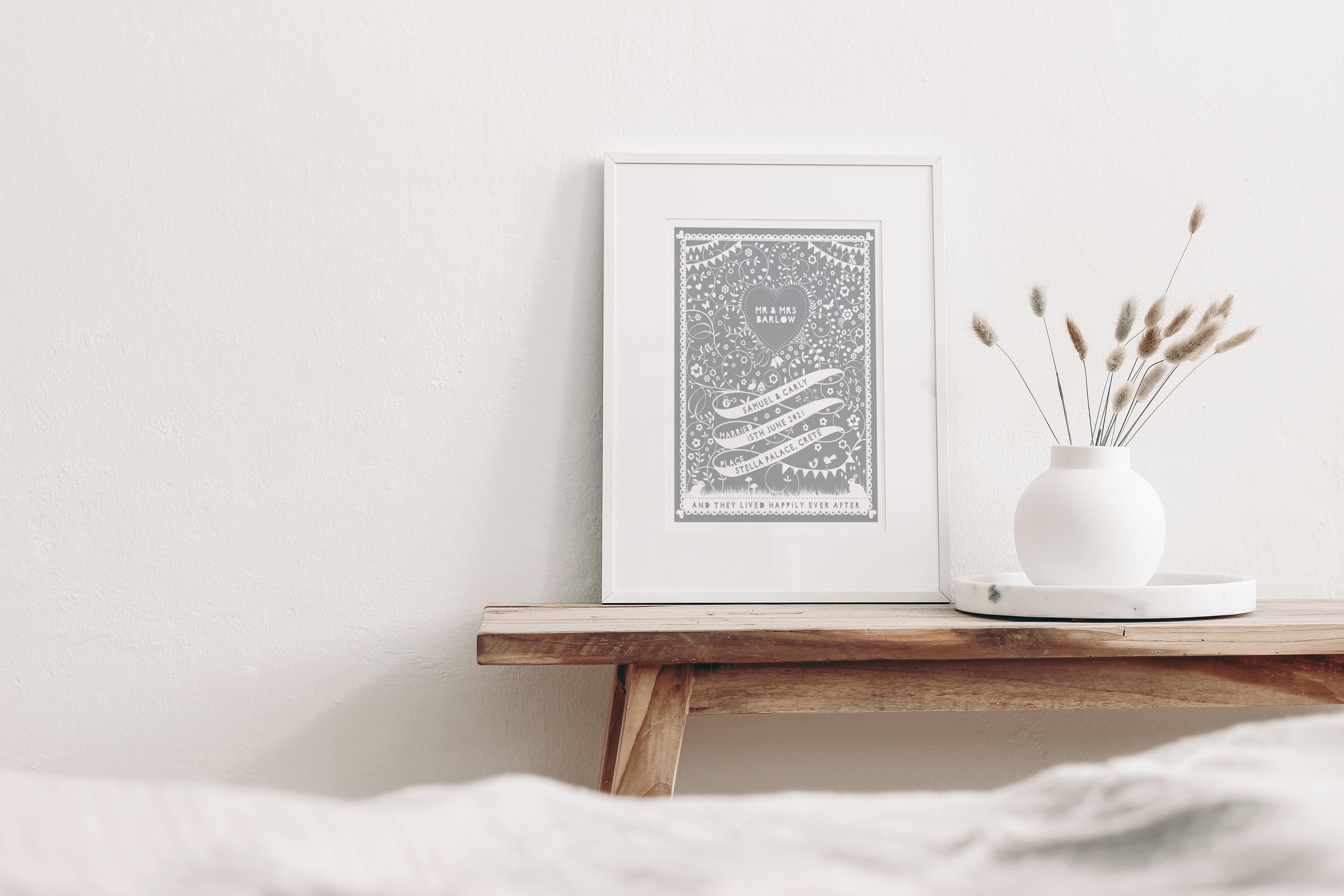 To complete your design, a chosen message can be presented at the bottom of your print., e.g. 'and they lived happily ever after...'