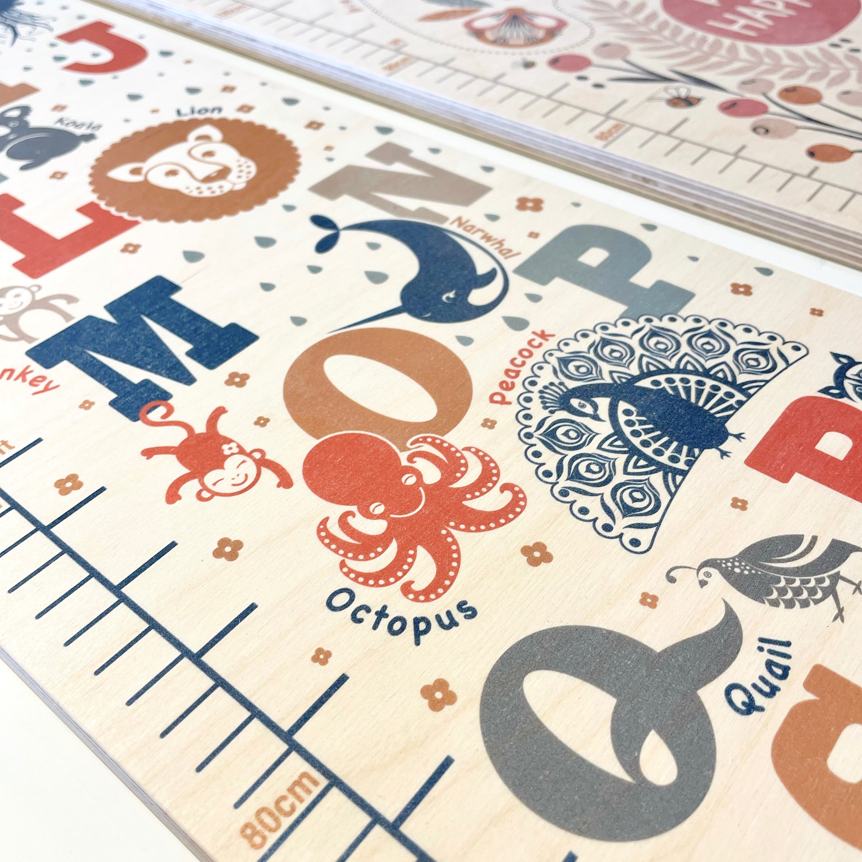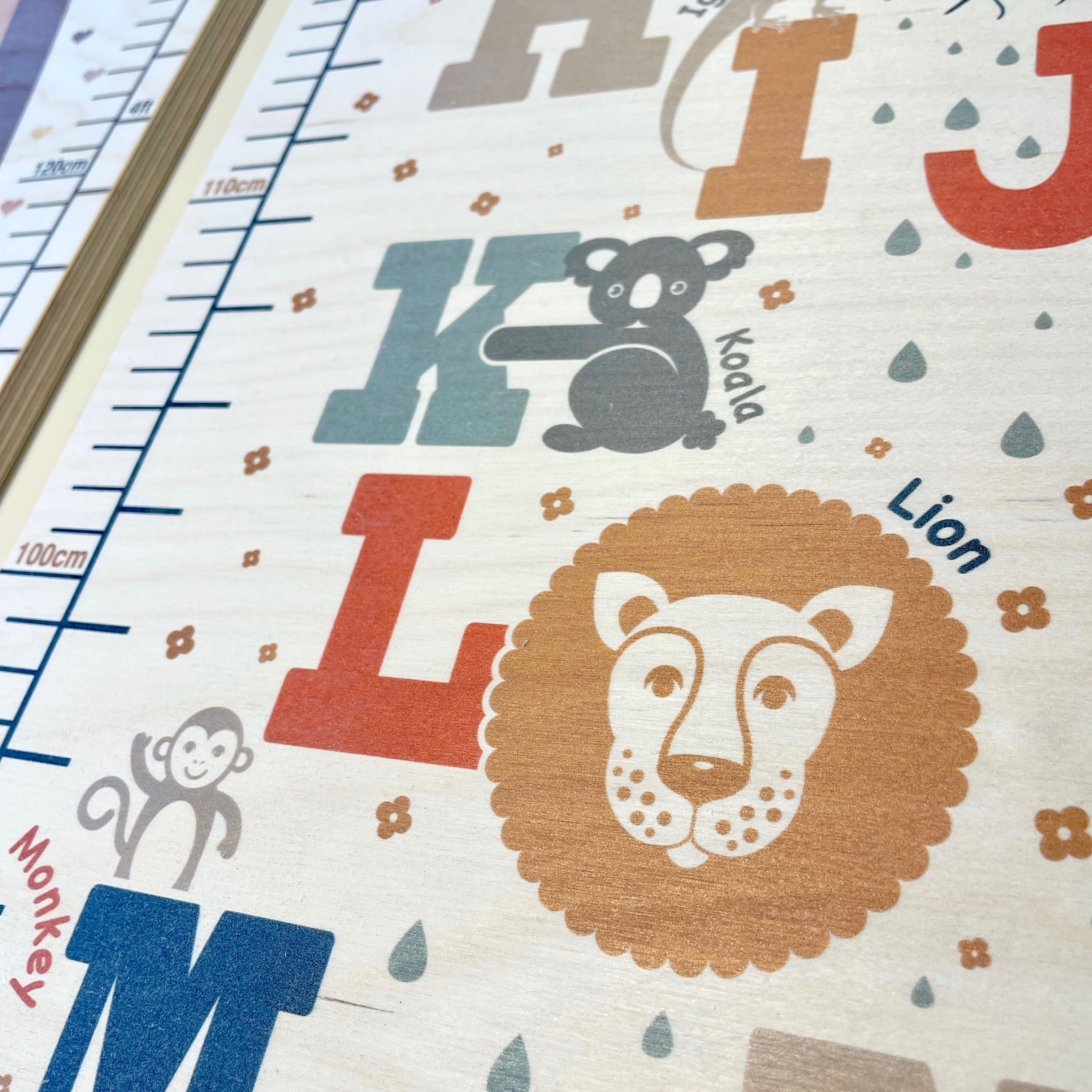 Our animal alphabet height chart printed in neutral tones will compliment any nursery, playroom or child's bedroom decor.