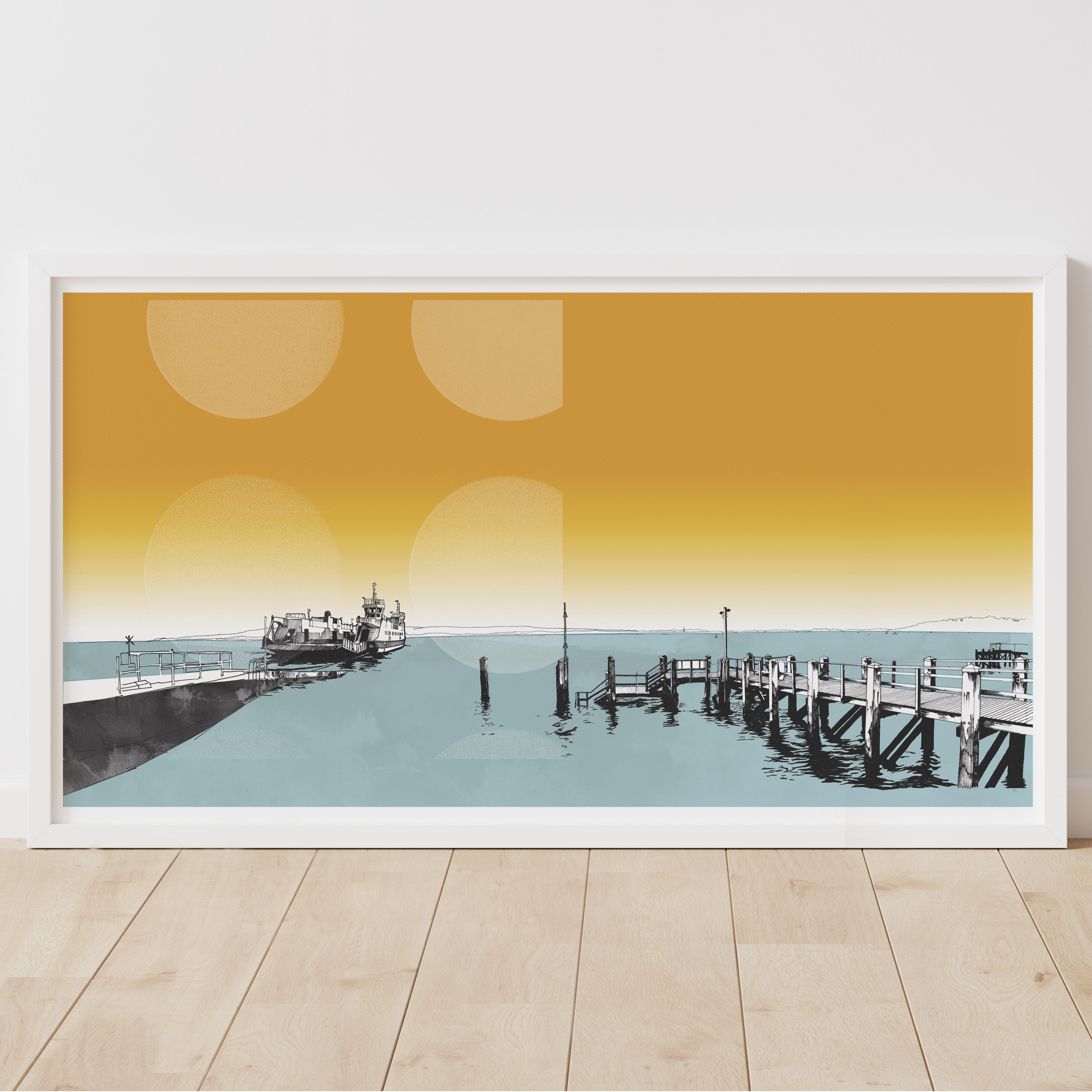 A limited edition print of our hand drawn Sandbanks Chain Ferry sailing across the beautiful Poole Harbour with distant views of the Purbecks.