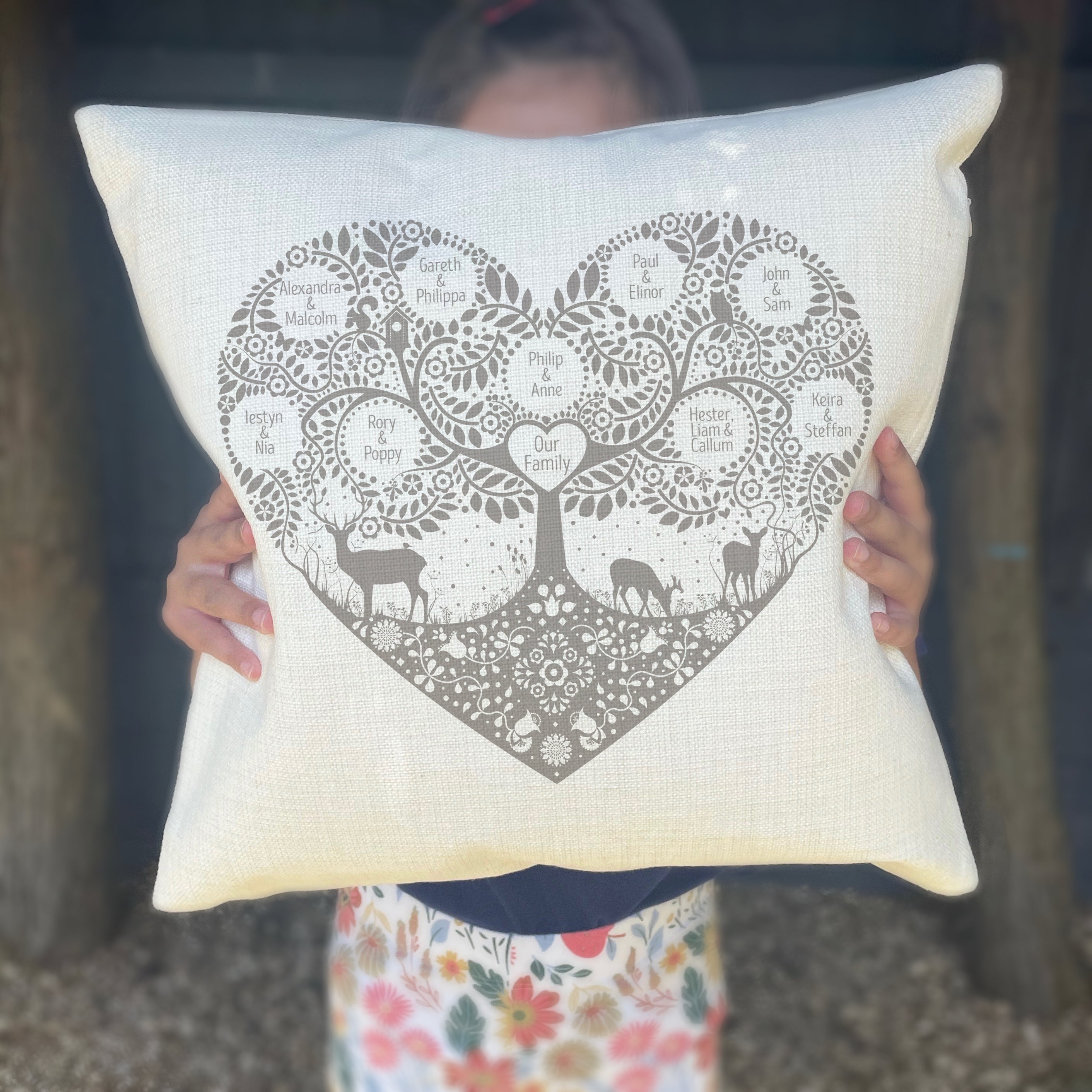 Surprise your loved one with this thoughtful, personalised woodland heart family tree cushion.